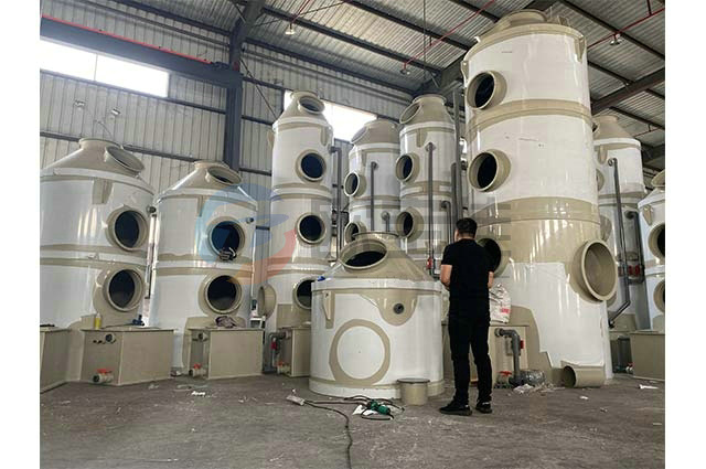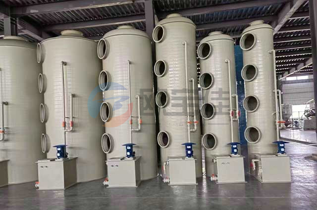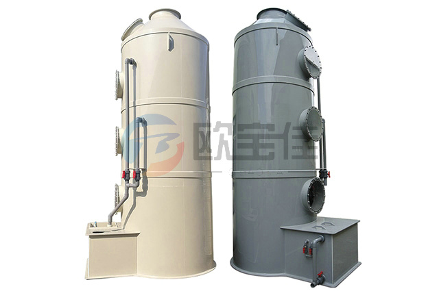 PP喷淋塔也叫做PP洗涤塔、酸雾净化塔--酸碱废气处理设备; 喷淋塔工作原理:废气由风管引入净化塔,经过填料层,废气与吸收液进行气液两相充分接触吸收中和反应,废气经过净化后,再经除雾板脱水除雾后由风机排入大气。废气达到地方排放标准的排放要求。