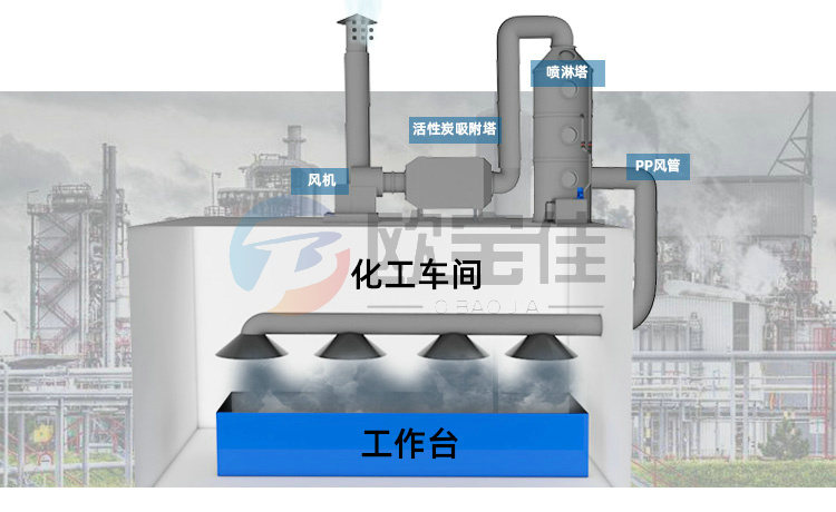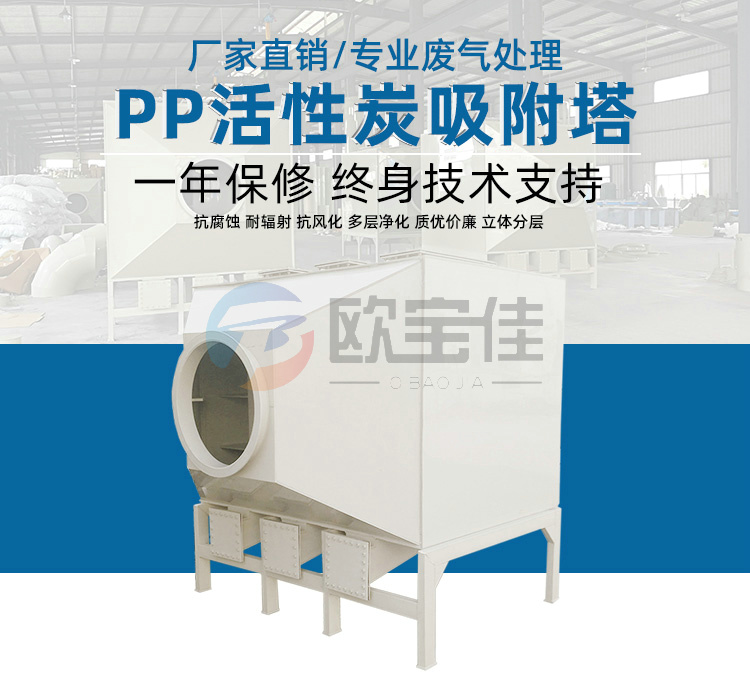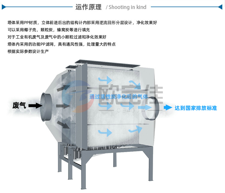 活性炭吸附塔是处理有机废气、臭味处理效果最好的净化设备。当粉尘和颗粒物比较多时,活性炭吸附装置同时与水喷淋塔使用,达到废气净化达标排放。 活性炭吸附塔工作原理:活性炭吸附设备主要是,利用多孔性固体吸附剂活性炭的吸附作用,有效阹除工业废气中的有机污染物质和色味等;含尘气体由风机提供动力,正压或负压进入塔体,由于活性炭固体表面上存在着未平衡和未饱和的分子引力或化学力,因此当此固体表面与气体接触时,就能吸引气体分子,使其浓聚并保持在固体表面,污染物质从而被吸附,废气经过滤器后,进入设备排尘系统,净化气体高空达标排放,从而达到净化废气的目的。