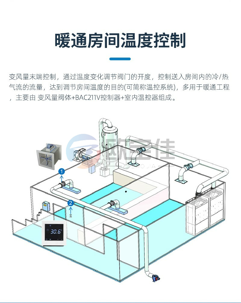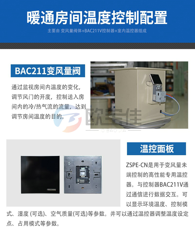 变风量末端控制,通过温度变化调节阀门的开度,控制送入房间内的冷/热气流的流量,达到调节房间温度的目的(可简称温控系统),多用于暖通工程,主要由变风量阀体+BAC211V控制器+室内温控器组成。